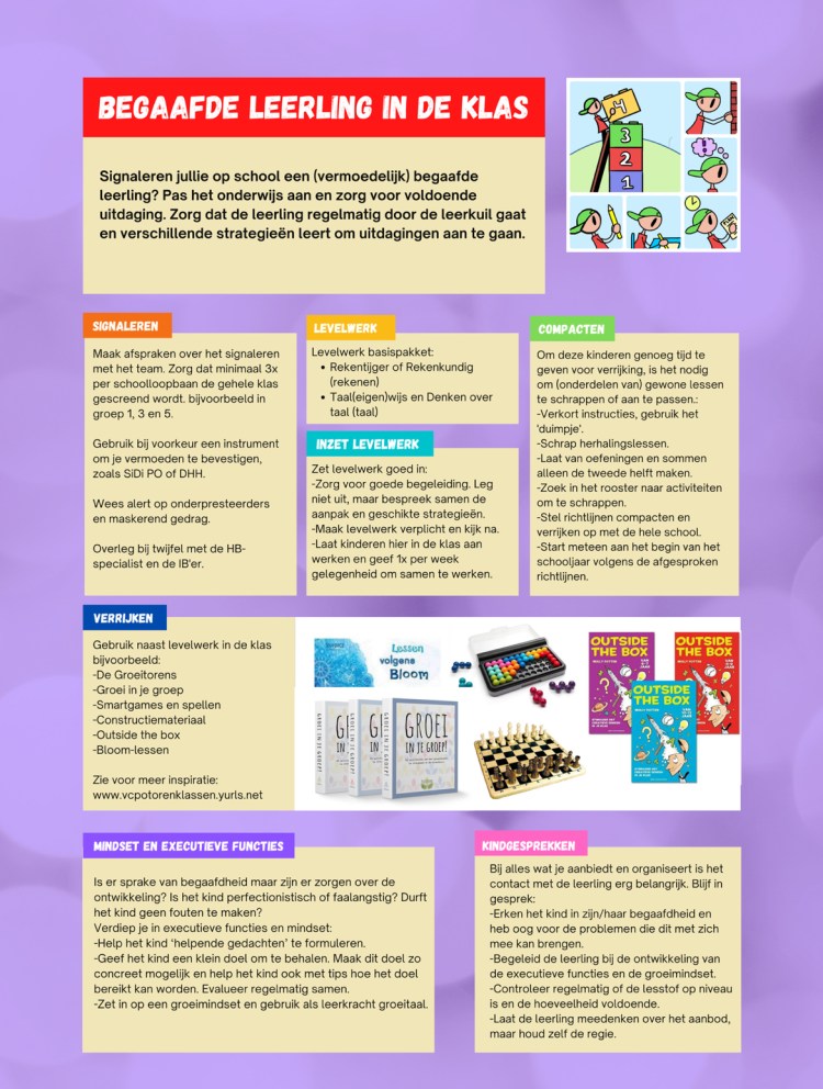 Het is mijn persoonlijke missie om te zorgen voor een aangepast beleid in alle groepen van de basisscholen voor hoogbegaafde leerlingen. Voor in de groepsmap en aan de muur ontwikkelde ik twee posters, die dit beleid zichtbaar maken.